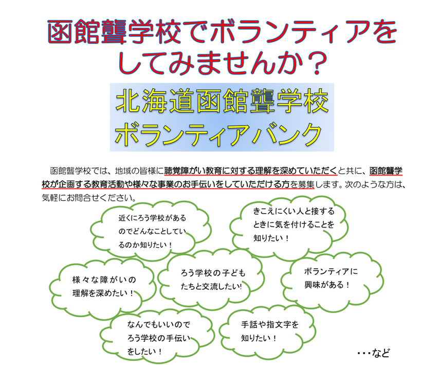 令和6年3月4日にホームページを新しくしました。以前のホームページは約5年間でのべ64万人以上の方に見ていただきました。今後も函館聾学校(はころう)の活動を発信していきます。