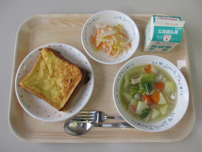 *フレンチトーストは、牛乳、卵、砂糖で作った液にパンをひたし、バターをのせてオーブンで焼き上げ、仕上げにメープルシロップをかけました。ほんのり甘く、おいしく焼き上がりました。