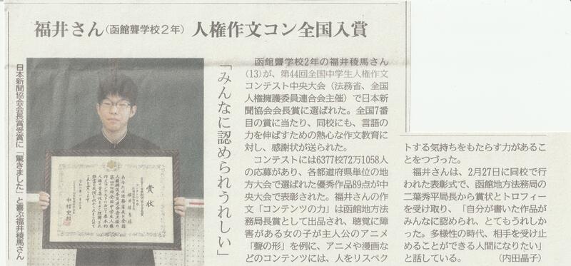 「第44回全国中学生人権作文コンテスト函館地方大会」の表彰式の様子が北海道新聞(函館道南版)、函館新聞に掲載されました。改めて、受賞した本校2名の生徒にとっても、本校にとっても大変喜ばしいことであります。