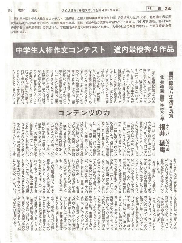 本校の生徒2名が、「第44回全国中学生人権作文コンテスト函館地方大会」において、最優秀賞と優秀賞を受賞しました。