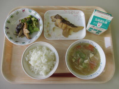 *ごま汁の昆布と煮干しのだし、煮びたしのかつおだし、出汁のうま味を味わわせたい和食給食です。