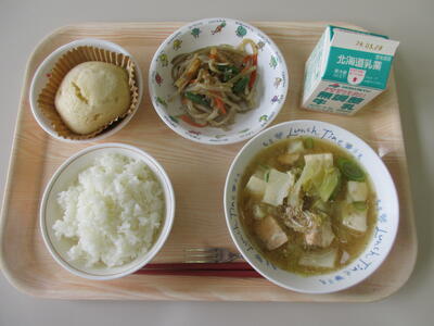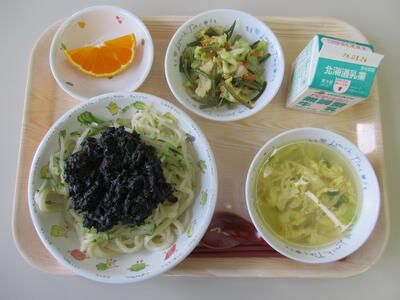 *岩手県の郷土料理、盛岡じゃじゃ麺とよくセットで食べられるチータンタンをイメージした卵スープを献立にしました。黒ごまたっぷりのじゃじゃ麺を初めて食べる子どもも多く、新しい味との出会いになったようです。