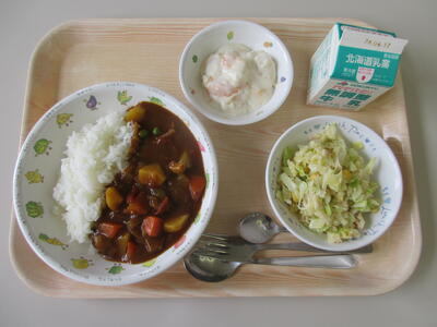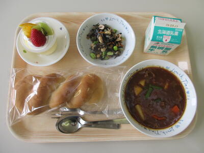 初日の今日は、子どもたちに人気があり食べやすいカレーライスです。幼稚部、小学部、中学部の子どもたちみんなが、ほぼペロリと平らげてくれました。