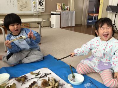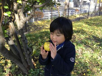 校庭奥のビオトープでは、季節の移り変わりと共に、様々な植物の色や様子が変わったり、実が付いたりしてきました。面白い形の枝やきれいな色の葉、マルメロの実など、どれも魅力的で、子どもたちはどんどん見付けては拾って眺めたり、持ち帰ったりして楽しんでいます。