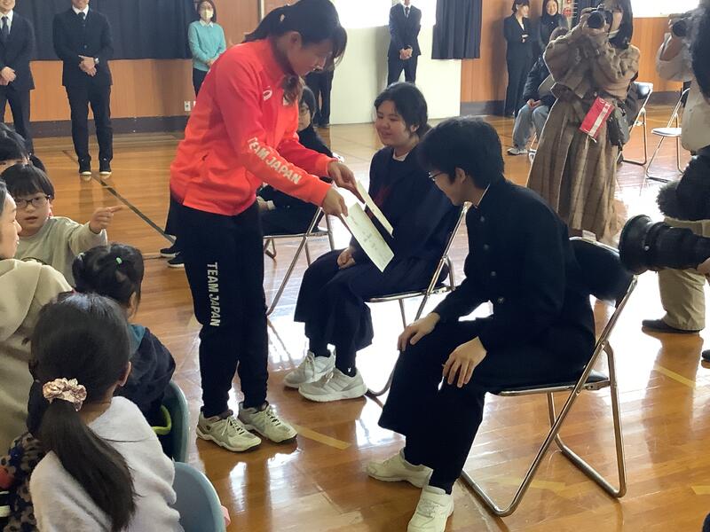 1月19日(月)にボウリングで東京2025デフリンピックに出場した櫻庭まどかさんの報告会を行いました。櫻庭さんは本校の卒業生で、これまでも中学部の生徒と一緒にボウリングをするなどして交流を深めてきました。報告会では櫻庭さんから幼児児童生徒へ結果報告を行い、入賞した賞状を子どもたちに披露しました。今後については2029年にギリシャ・アテネで開催されるデフリンピック出場を視野に入れており、最後は皆で櫻庭さんにサインエールを送り、これからも応援していく気持ちを伝えました。