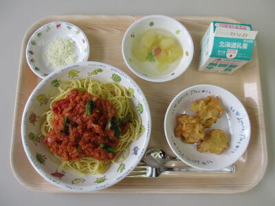 *今日の給食時間は、スパゲッティを食べながら、アラビアータの意味や、パスタの種類について学習しました。